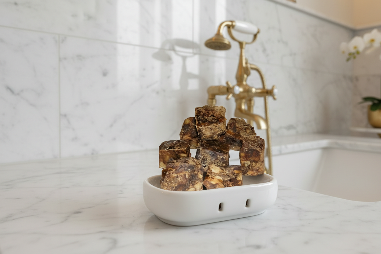 Black soap is generally made from locally harvested African plants such as plantain, cocoa pods, palm tree leaves and shea tree bark. The ingredients are sun-dried and roasted, which is how it gets its deep color. Water and oils such as coconut, palm and shea butter are then added